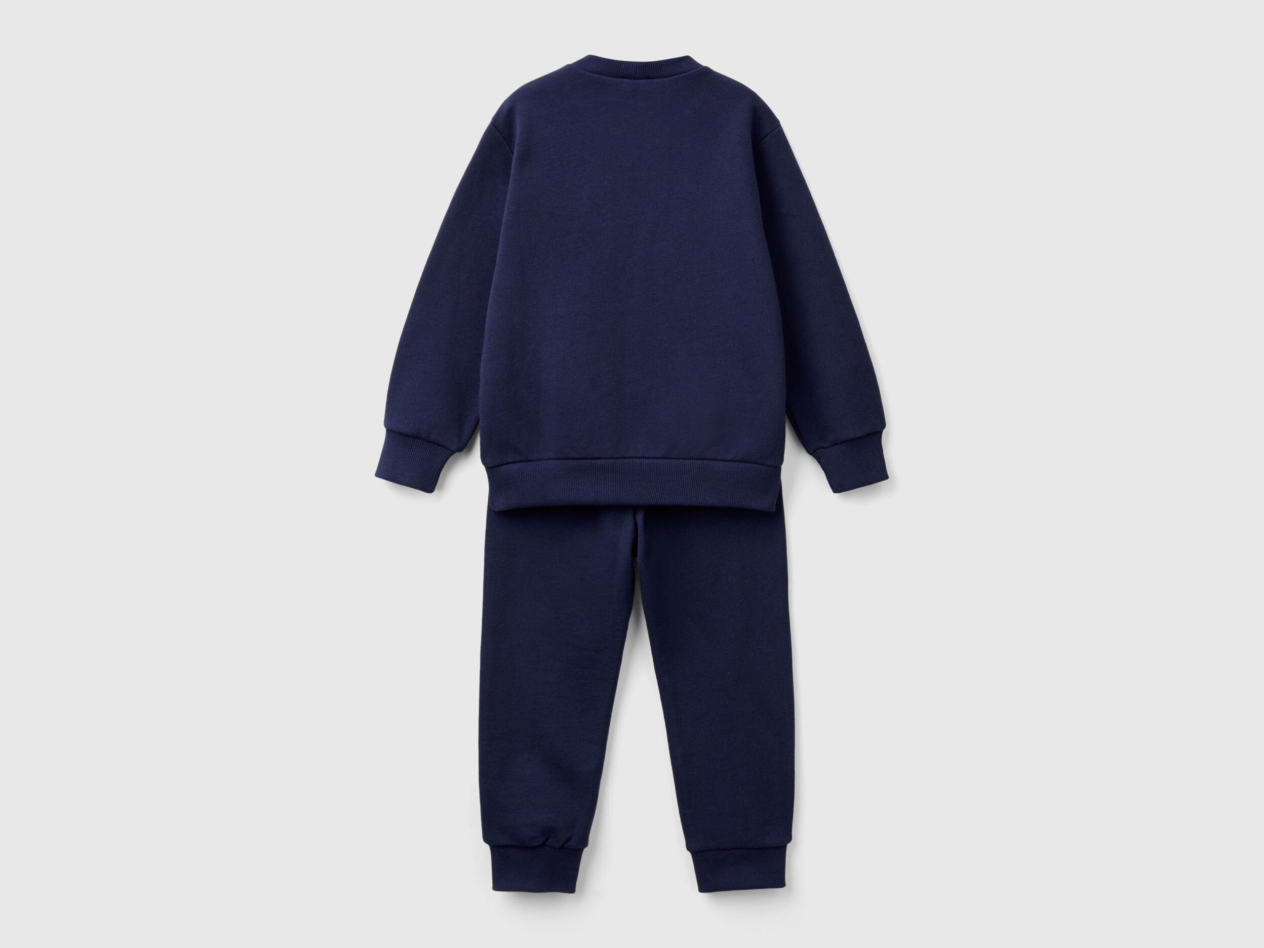 Outfit in pure cotton fleece with a firm but light feel. Long sleeve crew neck sweatshirt with front print. Long trousers with internal elastic waistband, elastic ribbed leg bottoms, patch pocket on the back with logo label. Sporty and comfortable, perfect for school and leisure time.