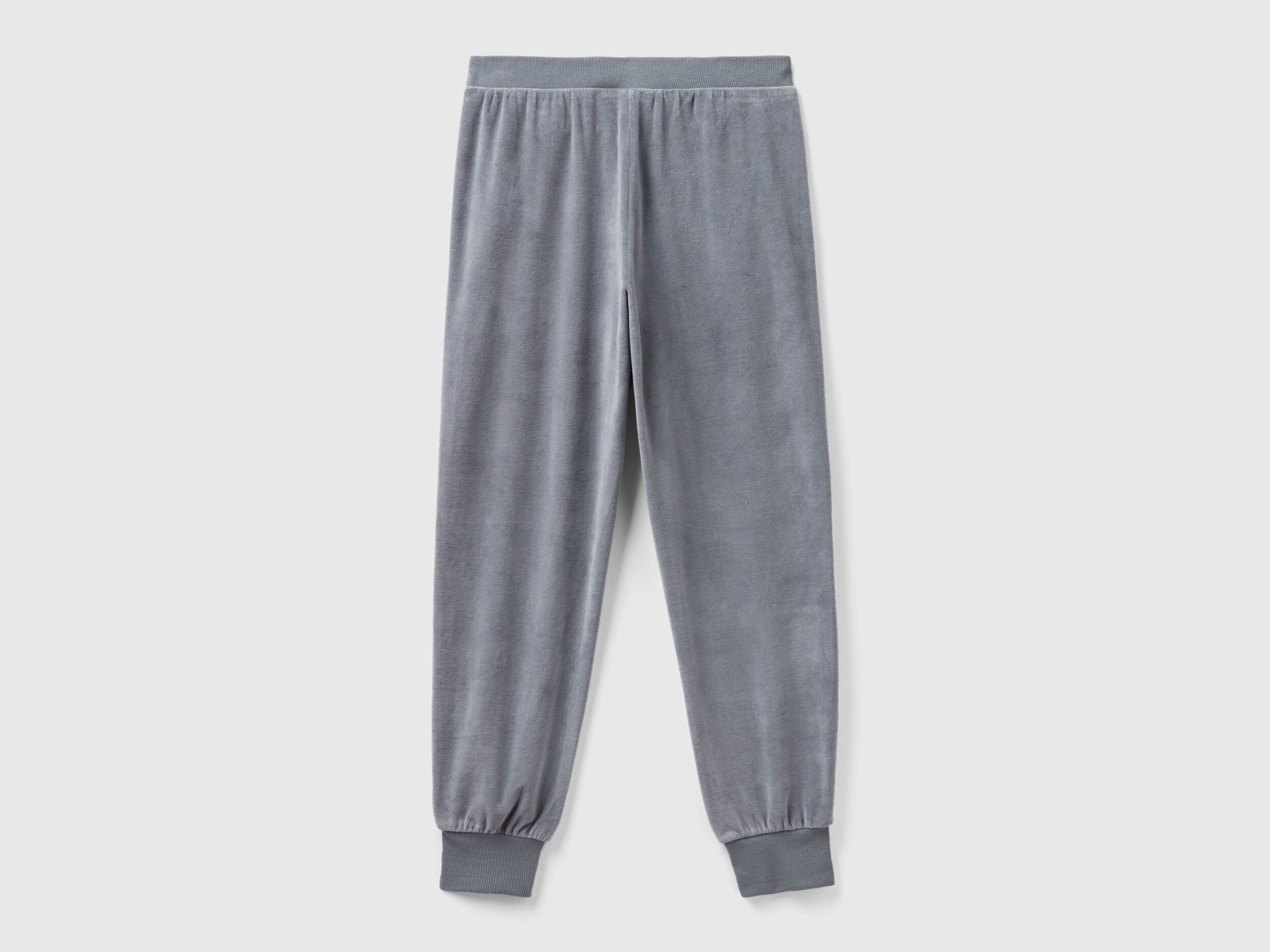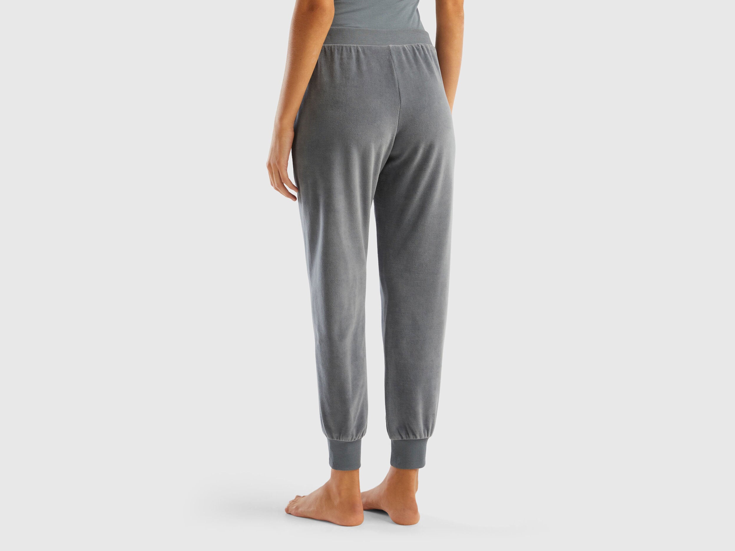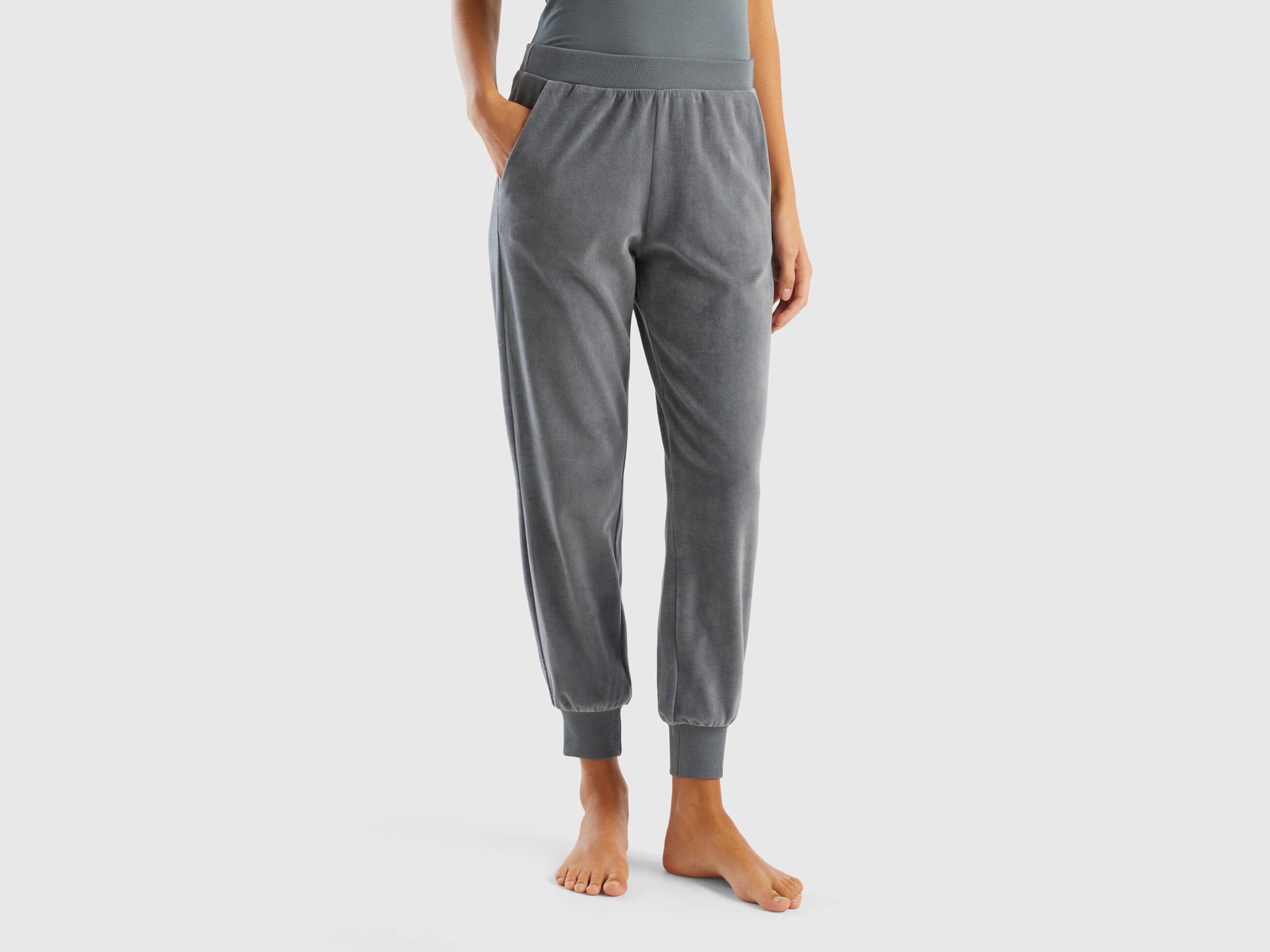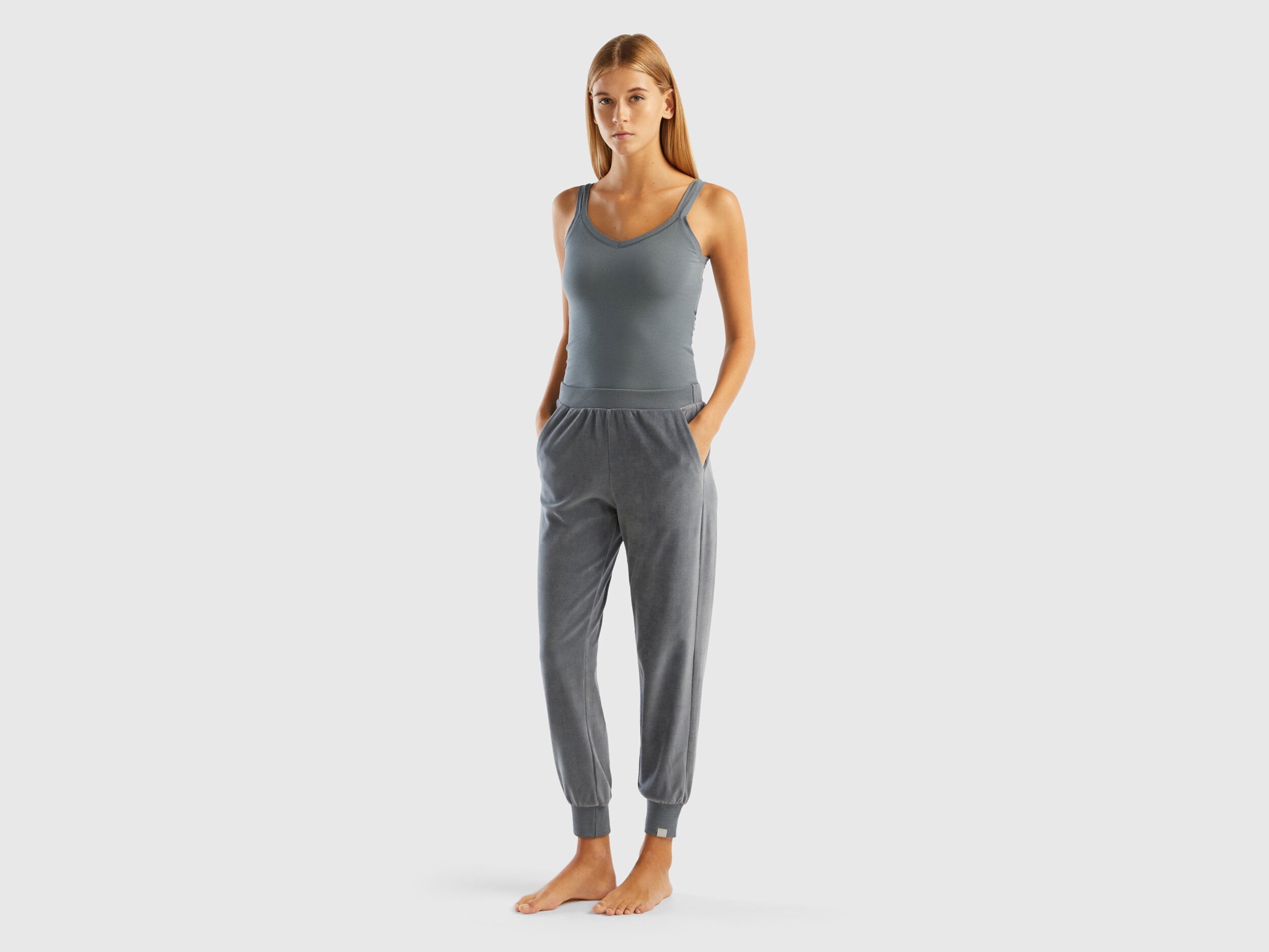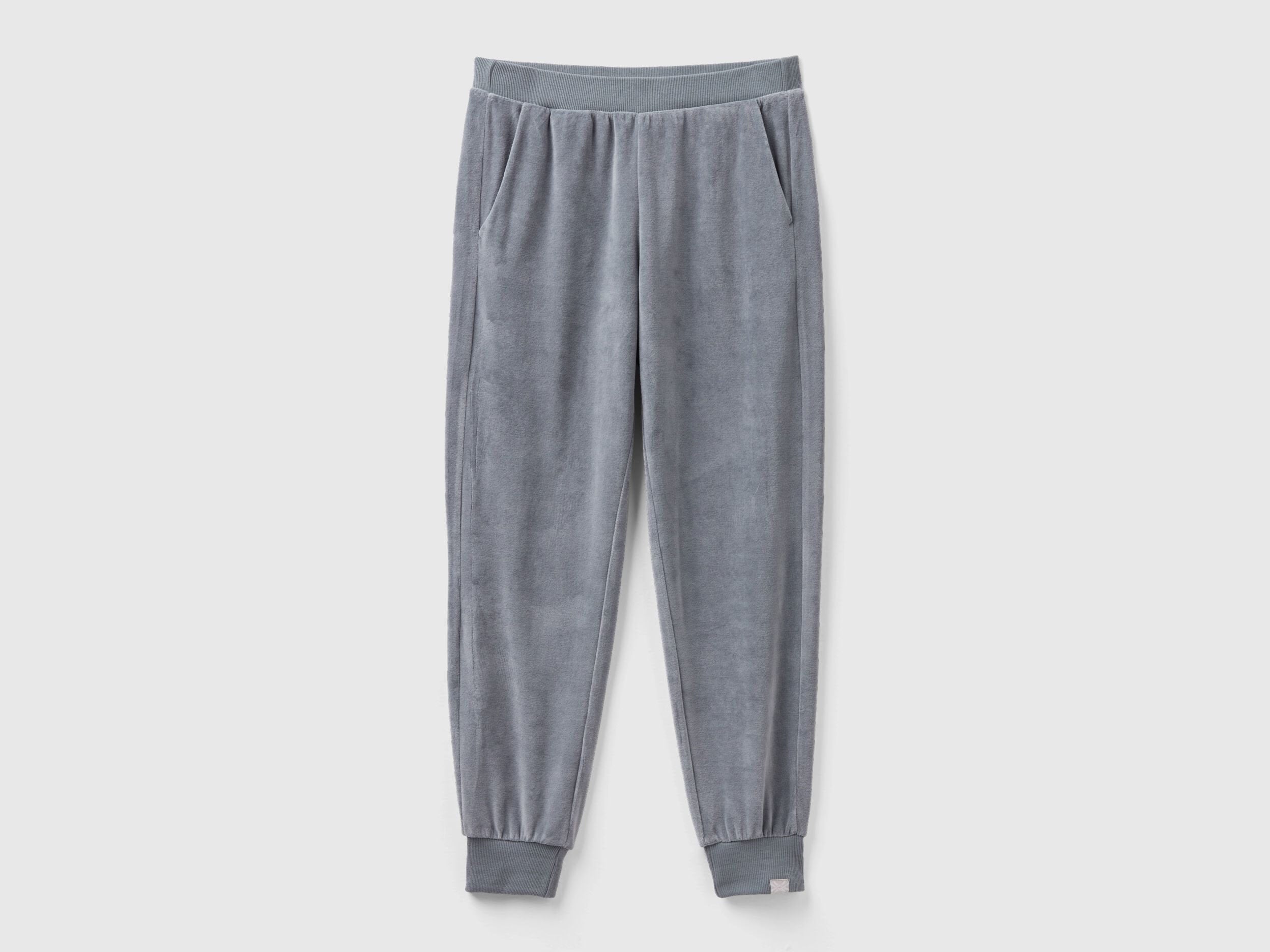 Long trousers in soft cotton blend chenille. Waist with inner elastic, practical front pockets and ankle guards at the bottom.